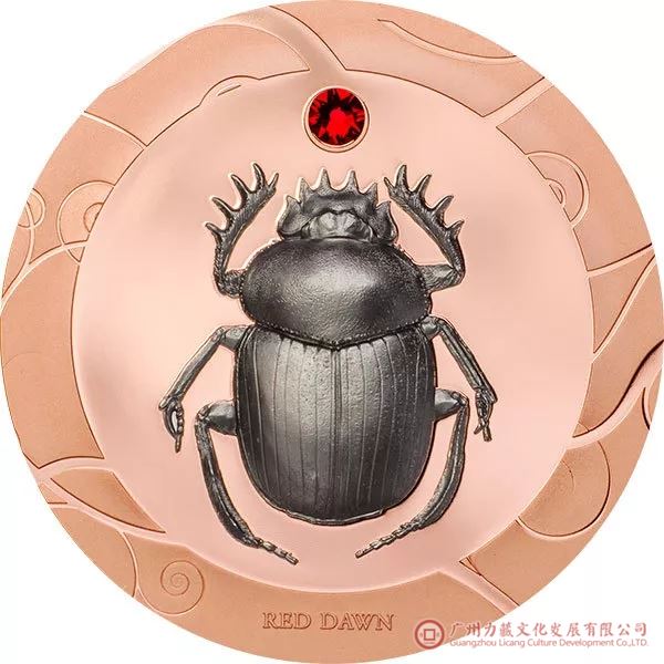 “红色黎明”是库克群岛发行的“圣甲虫”系列纪念币之一。硬币两面镀玫瑰金,背面浮雕为圣甲虫,黑色乃镀铑层,一颗红色的施华洛世奇水晶嵌在圣甲虫上方,有如朝阳。该币成色为99.9%,重量为1盎司,直径为38.61毫米,发行量为499枚。