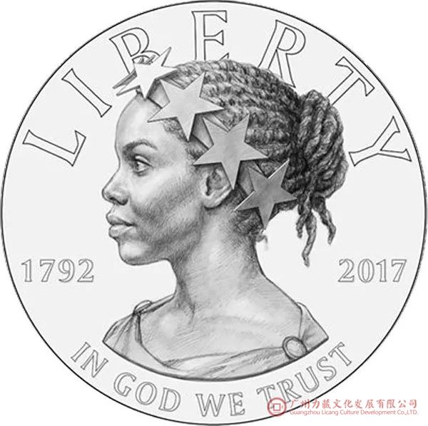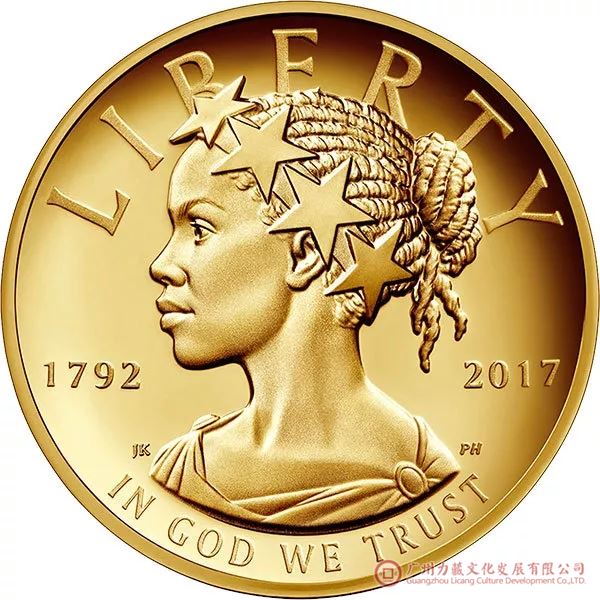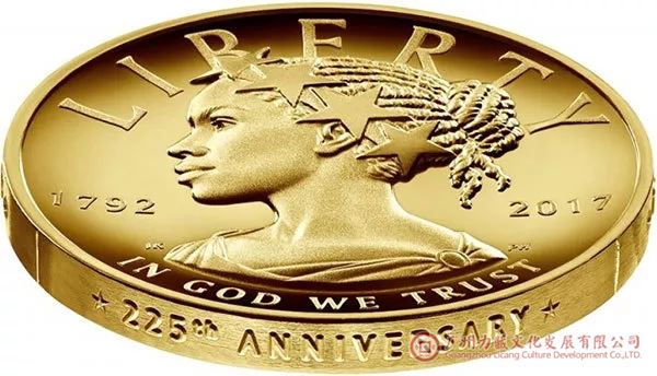 在人们的印象中,自由女神一直是西方白人的女性形象,但在2017年,她以黑人女性的形象在一枚硬币上出现了,这就是“美国铸币局成立225周年”高浮雕金币。这枚金币的正面图案为头戴星冠的黑人自由女神像,背面图案是代表美国的雄鹰。该币成色为99.99%,重量为31.108克,直径为30.61毫米,发行量为100000枚。