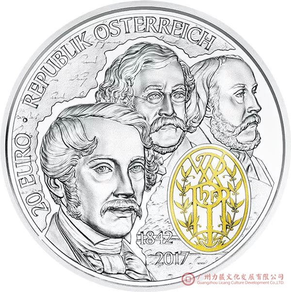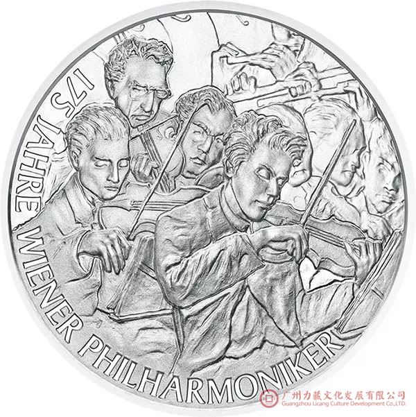 维也纳爱乐乐团尤其著名,它是目前顶尖的古典交响乐团之一,创立于1842年,是为数不多的能够长久紧密地将历史与欧洲音乐艺术传统结合在一起的团队。2017年是维也纳爱乐乐团创立175周年,奥地利为此发行纪念币一枚。该币含银92.5%,重量为22.42克,直径为34毫米,发行量为30000枚。
