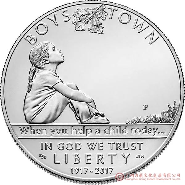 2017年是男孩镇成立100周年,美国为此发行了一枚纪念币。该币成色为90%,重量为26.73克,直径为38.1毫米,发行量为350000枚。