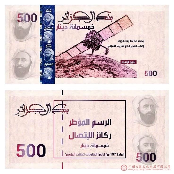 500第纳尔:在正面描绘从非洲大陆上空运行的阿尔及利亚通信卫星ALCOMSAT-1,该卫星是2017年12月10日在中国四川西昌卫星发射中心发射的第一颗阿尔及利亚通信卫星。 该卫星的使用寿命为15年,由阿尔及利亚航天局负责监督,该机构的职能是电信,电视广播和互联网连接。