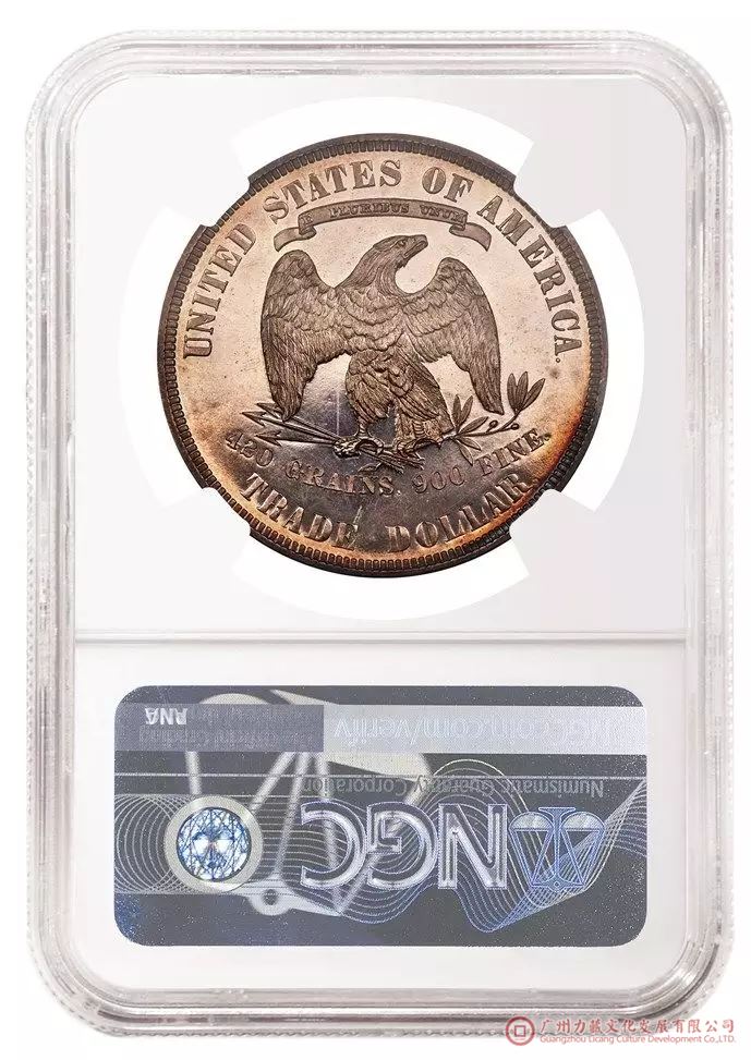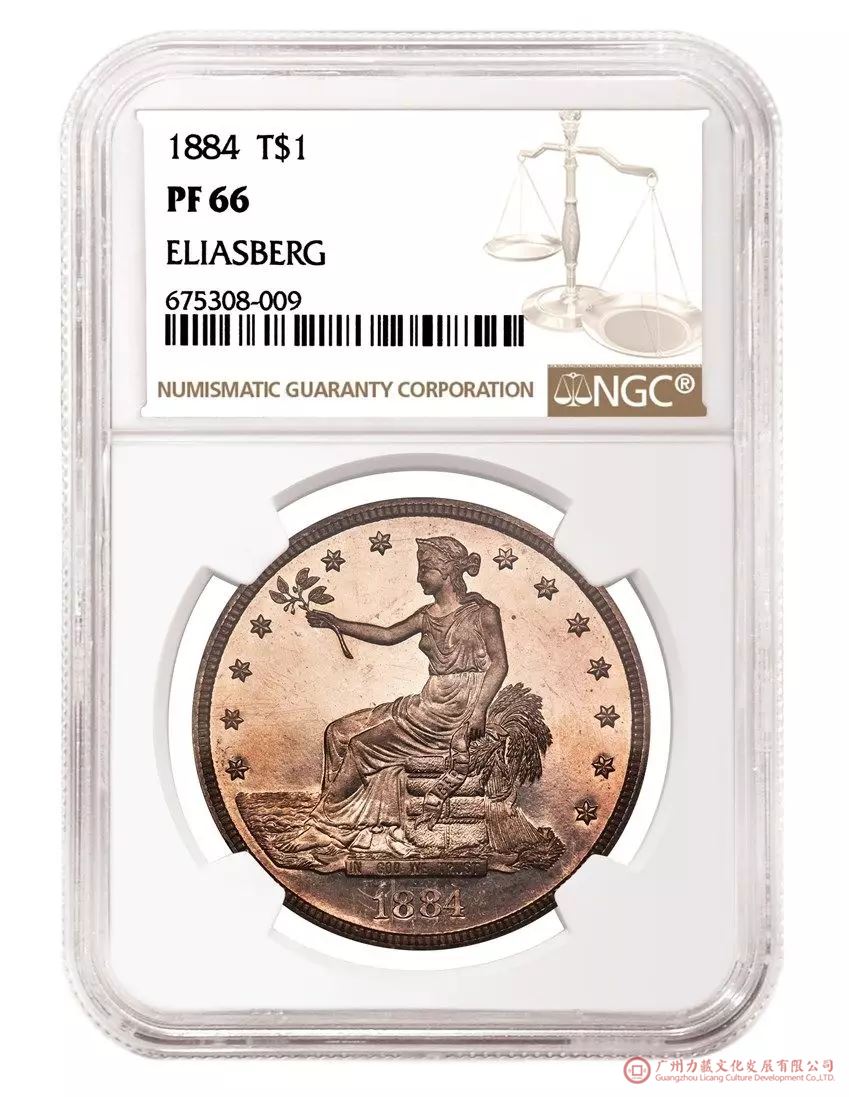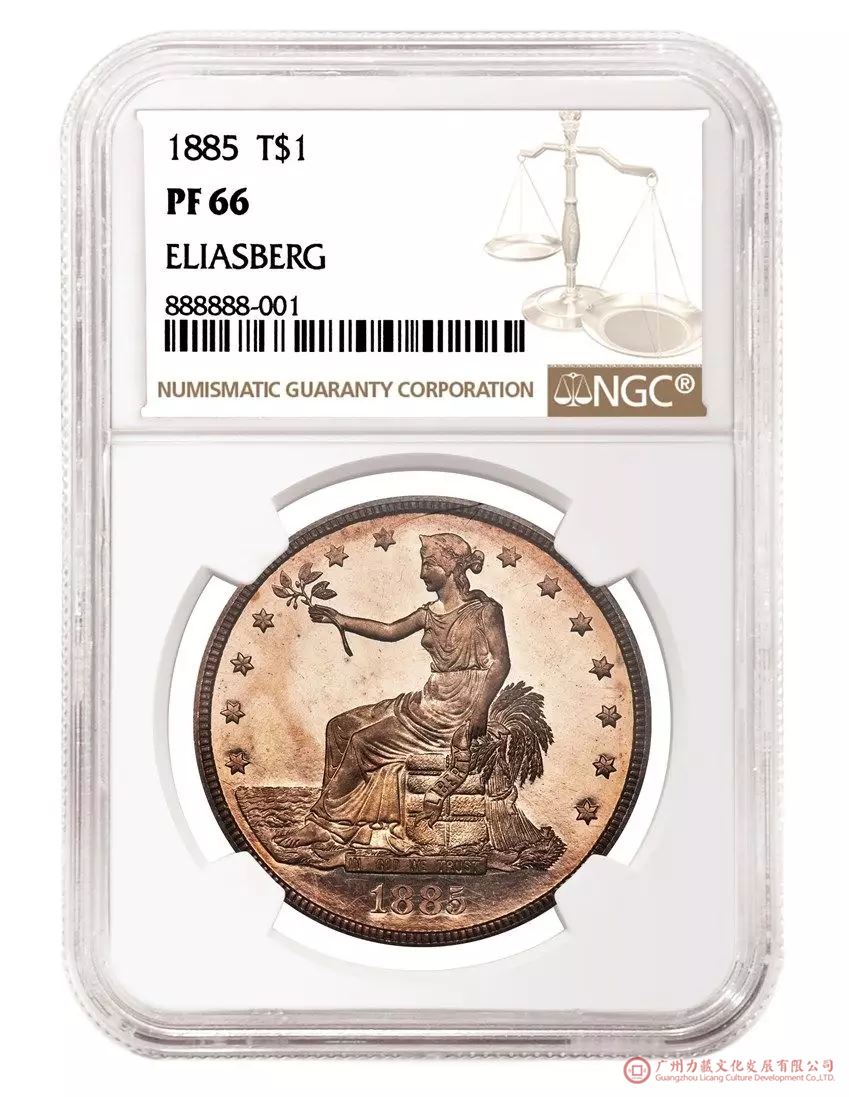 此枚1885年贸易银元的评级为NGC PF 66,其系谱为著名的路易斯·E·伊利亚斯伯格收藏(Louis E. Eliasberg Collection),它是仅存已知5枚当中最为精美的一枚。它的罕见程度匹敌著名的1913年自由女神像镍币,这让它成为美国钱币收藏界中最受追捧的硬币之一。