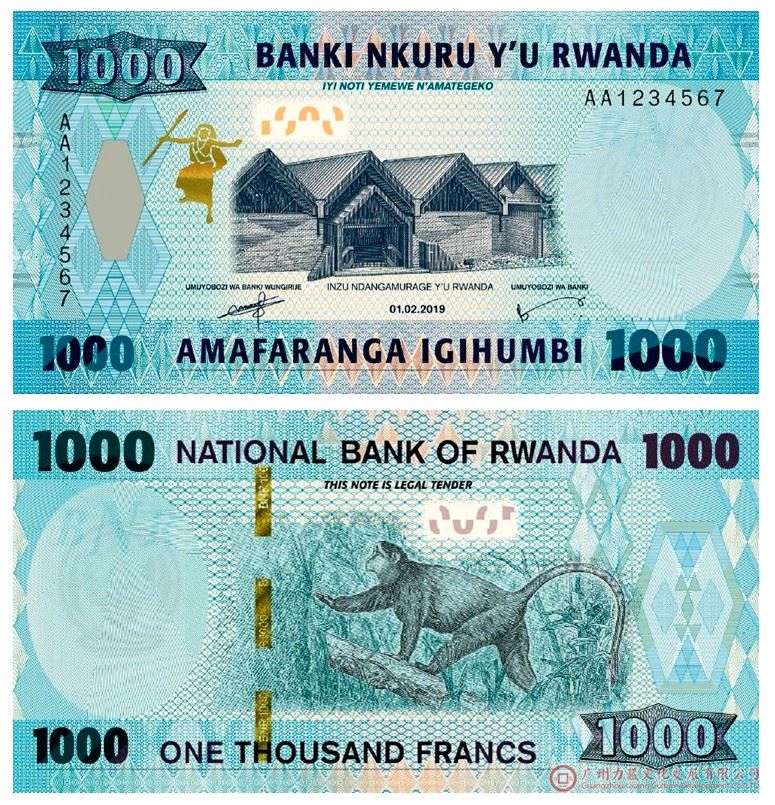 1000法郎:这张钞票保留了与上一系列相同的蓝色图案和尺寸,以及同样的图案和特征。这张纸币包含对民族博物馆的描绘,该博物馆以前是卢旺达国家博物馆,位于南部省份的布塔雷,是卢旺达的前殖民首都。纸币的背面为一只金丝猴的照片,金丝猴是撒哈拉以南非洲中部地区的一种常见物种,居住在火山国家公园(Volcanoes National Park)。纸币的尺寸为140×72毫米,正面显示的日期为2019.2.1。
