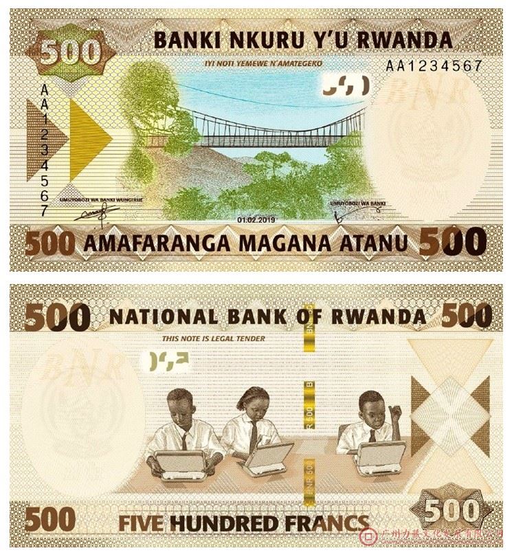 500法郎:这一系列的新钞票在配色方案上已从以前的绿色改为主要的棕色,并有相应的色调。这张脸描绘了Nyungwe树冠,这是一条位于Nyungwe国家公园的人行道,这是一片未被触及的天然雨林,位于卢旺达的西南角,充满了令人兴奋的生物多样性。新纸币背面显示有三名携带笔记本电脑的年轻学生,反映了卢旺达利用信息技术促进和加强优质教育的努力。纸币的尺寸为135 x 72毫米,正面显示的日期为2019.2.1。