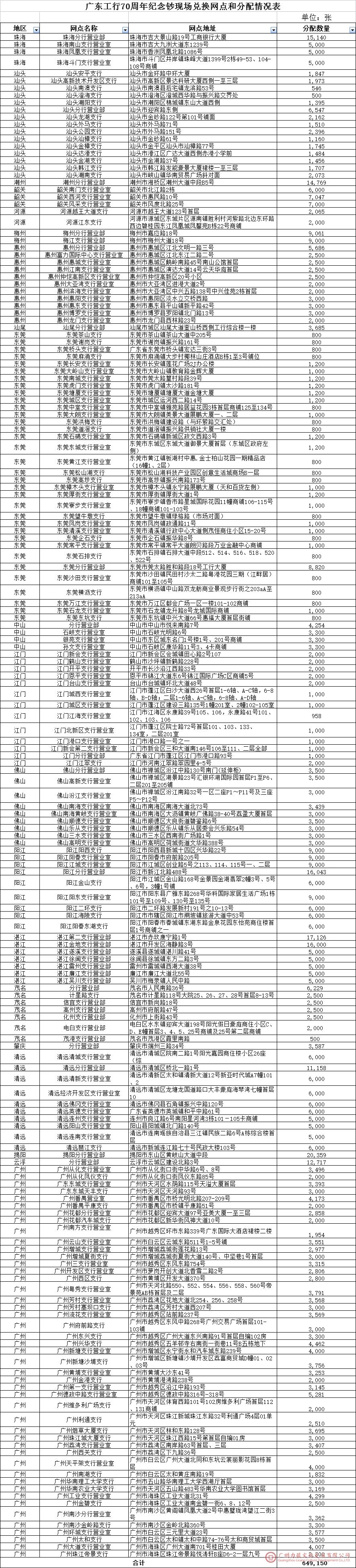 (一)现场兑换网点和分配数量各地区70周年钞现场兑换网点和分配数量请见附件《人民币发行70周年现场兑换网点和分配情况表》。