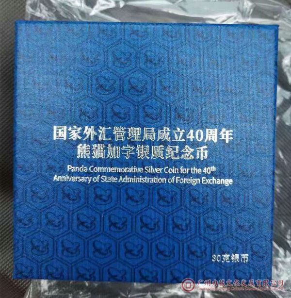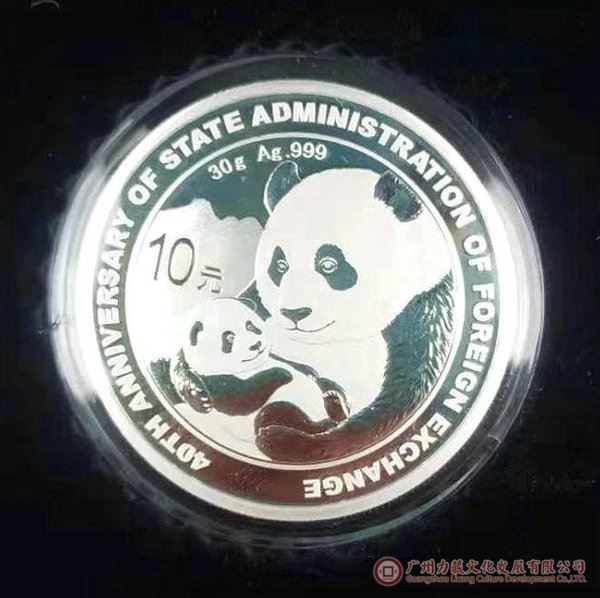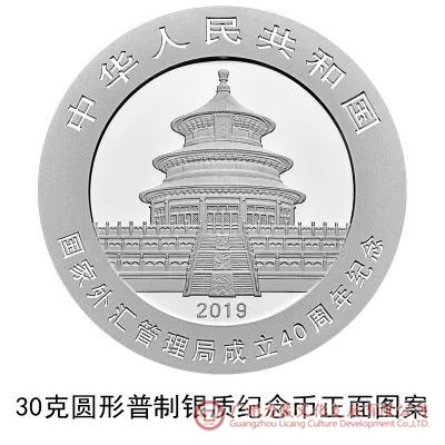 国家外汇管理局成立40周年熊猫加字银质纪念币正面图案为北京天坛祈年殿,并刊国名、年号及“国家外汇管理局成立40周年纪念”中文字样。