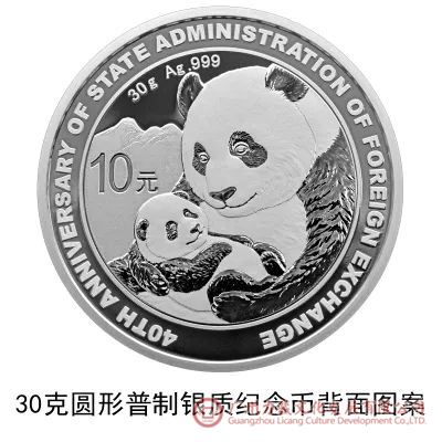 该银质纪念币背面图案为母子熊猫图,并刊“30g Ag .999”字样、“国家外汇管理局成立40周年纪念”英文字样及面额。