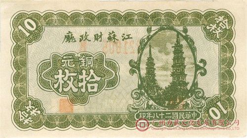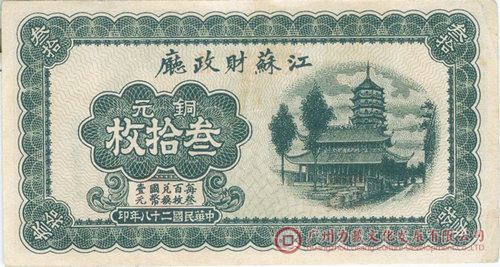 第二种为叁拾枚铜元券,尺寸为纵56、横108毫米,由大东书局有限公司印制,正面图案为苏州北塔寺(图2)。该寺位于苏州北塔公园之内,原名报恩寺,是苏州最古老的佛寺,距今已1700多年。其始建于三国吴赤乌年间(238—251),相传是孙权母亲吴太夫人舍宅而建,古称“通玄寺”。唐开元年间(713—741)改为“开元寺”。五代北周显德年间(954—959年)重建,易名为“报恩寺”。其占地1.2亩,塔高76米,重檐复宇,气魄雄伟,名满江南,有“江南第一”之誉。现其为全国重点文物保护单位,登临塔顶可俯瞰苏州全城。
