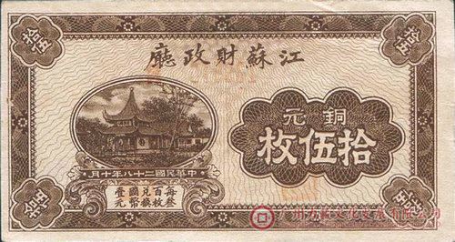 第三种则为伍拾枚铜元券,尺寸为纵52、横96毫米,由江苏地方石印厂印制,正面图案为苏州西园寺湖心亭(图3)。西园寺位于苏州古城阊门外留园路西端,始建于元至元年间,初名归元寺。明嘉靖年间(1522—1566),太仆徐泰时置建东园(今名留园),同时将归元寺改为宅园,易名“西园”。以后,其子舍宅为寺。明崇祯八年(1635),住持茂林和尚为弘扬“律宗”,改称“戒幢律寺”。“幢”是旗帜的意思,“戒幢”就是以戒律为旗帜,弘扬戒法的寺院,该寺成为当时著名的律宗道场之一。清咸丰十年(1860)毁于战乱。光绪初年(1875),由广慧和尚筹资建修,更名为“西园戒幢律寺”,俗称“西园寺”。而西园寺内的西花园,有一状似蝌蚪的水池,名谓“广仁放生池”,池中什锦鲤鱼五光十色,令人喜爱。更有著名的大鼋(斑鼋),已有四百多年的高龄。池周围建有厅榭回廊,池中有湖心亭一座,屹立池中,以曲桥贯通两岸,环水萦回,犹如岛屿,仿佛蓬莱。亭为六角,砖木结构,楼阁形式,双重飞檐,轻盈多姿,造型优美,构筑巧妙,实为亭中精品。