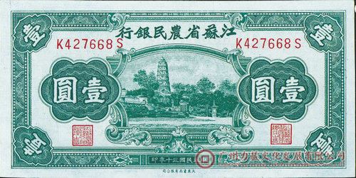 另外在民国三十年(1941),当时的江苏省农民银行还发行过带姑苏美景的壹圆券。其尺寸为纵61、横120毫米,由大东书局有限公司印制,正面图案为苏州虎丘塔(图4)。虎丘塔是驰名中外的古塔建筑,位于苏州市阊门外山塘街虎丘山山门内。相传春秋时吴王夫差就葬其父(阖闾)于此,葬后3日,便有白虎踞于其上,故名虎丘山,简称“虎丘”。此塔始建于五代后周显德六年(959),落成于北宋建隆二年(961)。塔七级八面,内外两层枋柱半拱,砖身木檐,是10世纪长江流域砖塔的代表作。由于宋代到清末此塔曾遭到多次火灾,故顶部的木檐均遭毁坏,现塔身高47.7米。1956年在塔内发现大量文物,其中有越窑、莲花石龟等罕见的传统艺术珍品。此塔为一座斜塔,自明代起由于地基原因,其就向西北倾斜,塔顶中心偏离底层中心2.3米,斜度2°40′,故被称为“东方比萨斜塔”。且1961年此塔即被列为全国重点文物保护单位。