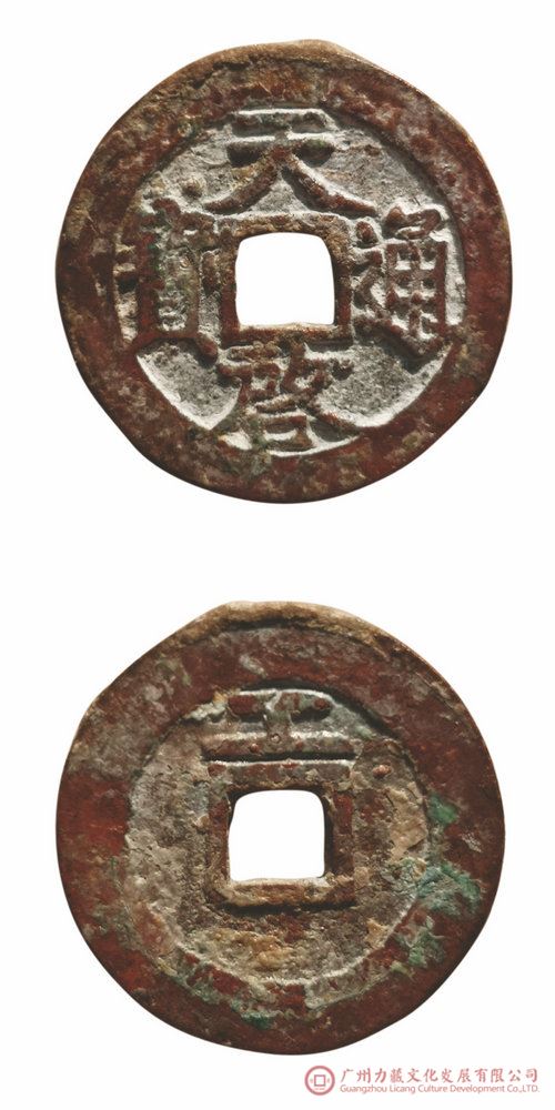 笔者近日偶然发现一枚与普通天启通宝上工钱不同的天启通宝上工钱(图2),此钱石灰坑口,直径25.4毫米,重3.81克,钱文直读,裹挟着斑驳的红斑,遒劲有力的字体,整个钱币呈现开门见山的状态。仔细与普通常品背上“工”钱相比较不同的是,是品背穿上“工”字不仅硕大,工字第三笔横长已经过穿,十分奇特,同时也与普通背工字钱面文有差异,于是果断付钱收入囊中。