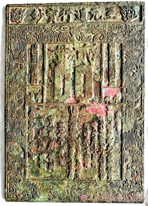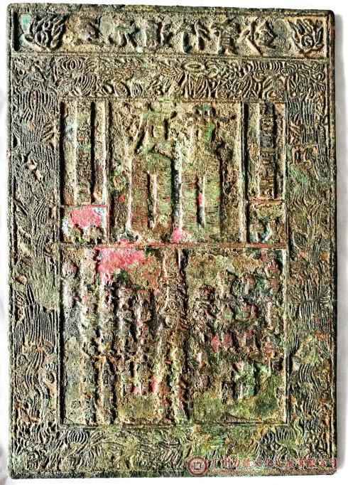 2、1973年,河北平山出土一件“至元通行宝钞贰贯及伍佰文”双面铜钞版。黄铜材质,双面均长25.3厘米,宽16.3厘米;厚1.1厘米,重2400克。