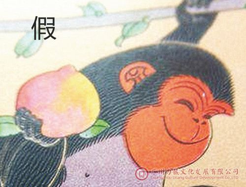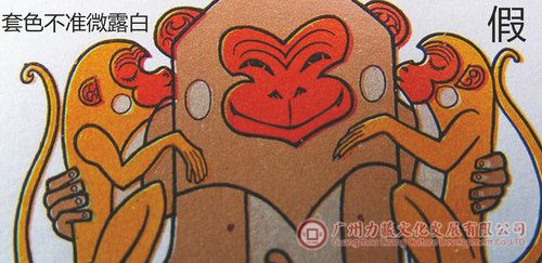 笔者曾接待过一位持15本《申猴吉祥》邮票大版折来鉴定的草根投资者。笔者鉴定认为:这15个《申猴吉祥》丙申年邮票大版折,其包装折为假冒,折内的邮票是采用胶雕套印方式印制的高仿票(图1)。