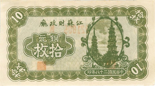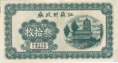 第二种为叁拾枚铜元券,尺寸为纵56、横108毫米,由大东书局有限公司印制,正面图案为苏州北塔寺(图2)。该寺位于苏州北塔公园之内,原名报恩寺,是苏州最古老的佛寺,距今已1700多年。其始建于三国吴赤乌年间(238—251),相传是孙权母亲吴太夫人舍宅而建,古称“通玄寺”。唐开元年间(713—741)改为“开元寺”。五代北周显德年间(954—959年)重建,易名为“报恩寺”。其占地1.2亩,塔高76米,重檐复宇,气魄雄伟,名满江南,有“江南第一”之誉。现其为全国重点文物保护单位,登临塔顶可俯瞰苏州全城。