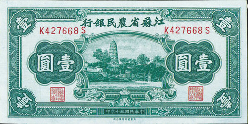 另外在民国三十年(1941),当时的江苏省农民银行还发行过带姑苏美景的壹圆券。其尺寸为纵61、横120毫米,由大东书局有限公司印制,正面图案为苏州虎丘塔(图4)。虎丘塔是驰名中外的古塔建筑,位于苏州市阊门外山塘街虎丘山山门内。相传春秋时吴王夫差就葬其父(阖闾)于此,葬后3日,便有白虎踞于其上,故名虎丘山,简称“虎丘”。此塔始建于五代后周显德六年(959),落成于北宋建隆二年(961)。塔七级八面,内外两层枋柱半拱,砖身木檐,是10世纪长江流域砖塔的代表作。由于宋代到清末此塔曾遭到多次火灾,故顶部的木檐均遭毁坏,现塔身高47.7米。1956年在塔内发现大量文物,其中有越窑、莲花石龟等罕见的传统艺术珍品。此塔为一座斜塔,自明代起由于地基原因,其就向西北倾斜,塔顶中心偏离底层中心2.3米,斜度2°40′,故被称为“东方比萨斜塔”。且1961年此塔即被列为全国重点文物保护单位。