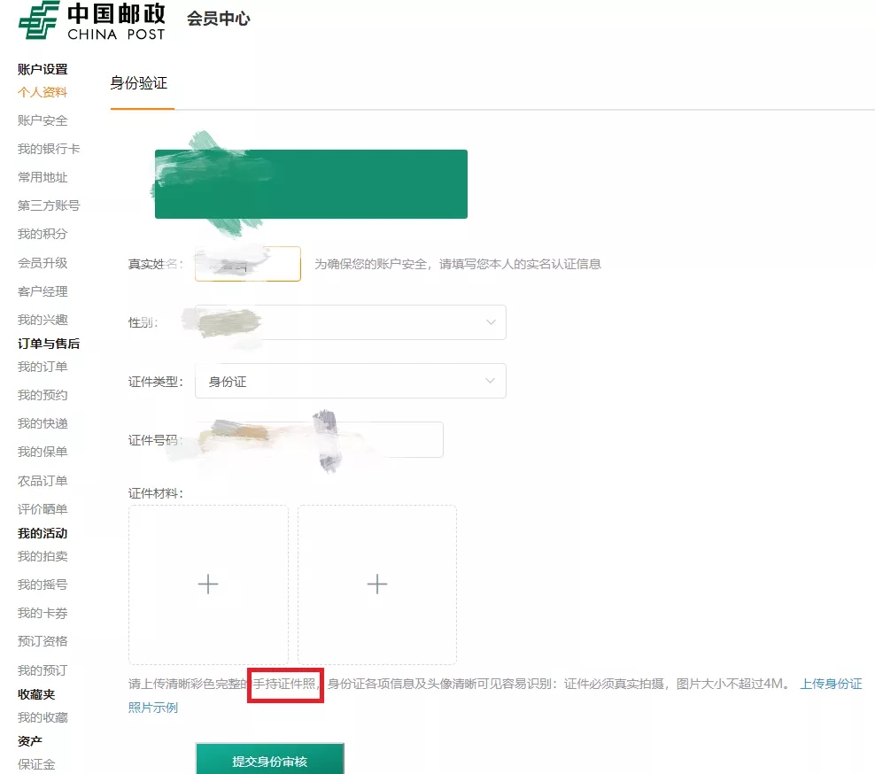 操作方法:打开邮政官网(https://mall.11185.cn)-会员中心-个人资料/账户安全-身份认证