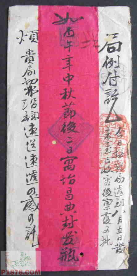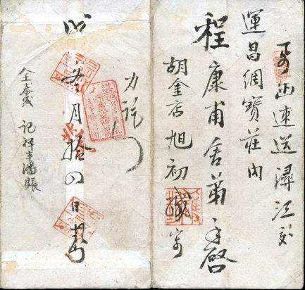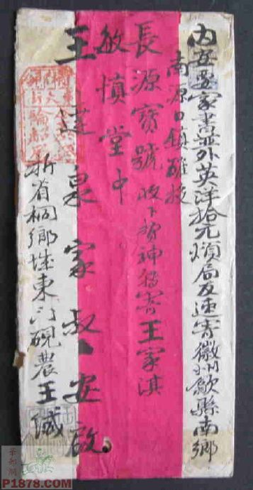 一、银信中式红条封上书“内要家书并外英洋拾元烦局友速寄徽州歙县南乡南源口镇确投/长源宝号帐下费神转寄王家淇敏慎堂中/王达泉家叔安启/浙省桐乡X东门砚农王缄”。左上方盖碑形双线三格“桐乡东大街全泰盛轮船局”戳红色。封背书“局例付讫”中又盖同式“桐乡东大街全泰盛轮船局”戳,下方书“今日接邮局送到八月五日发来函已收容后禀复又批”。中缝上下书“如瓶”“丙午年中秋节后二日寓怡昌典封发”(中秋后二日为丙午八月十七1906年)。左书“烦贵局切勿沿搁速送速递……”。封面竟书了近两百字!王砚农安徽歙县人,曾在浙江桐乡以及湖州南寻开典当是清光绪年间的一位富商。此件录自华邮网,以下两件由江苏朋友提供,发信人为同一人(附图一、图一A)。