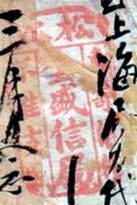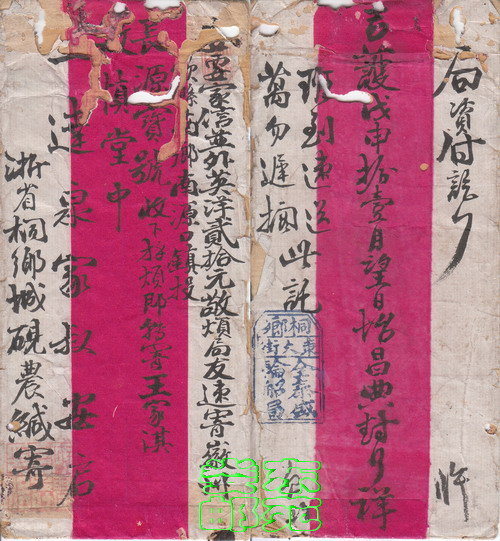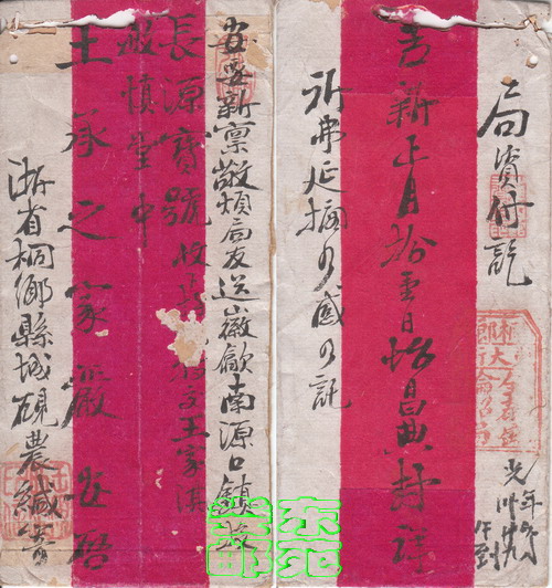 二、银信中式红条封上书“内要家信并外英洋贰拾元烦局友速寄徽州歙县南乡南源口镇确投/长源宝号收下烦即转寄王家淇敏慎堂中/王达泉家叔安启/浙省桐乡城砚农缄寄”。封背书“局资付讫”上下书“吉祥护戊申拾壹月望日怡昌典封”“班到速送万勿迟搁此托”(1908年)。下盖兰色“桐乡东大街全泰盛轮船局”戳形式同上(附图二、图二A)。