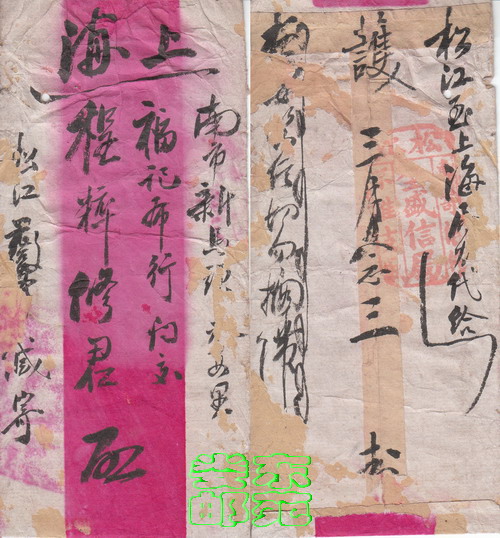 图四、A、经松江全盛信局邮上海南市,封盖四格碑形戳“松江全盛信局/专寄信扎/不准支取”,未记年。