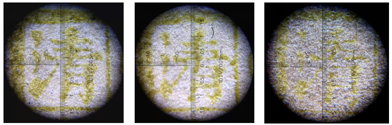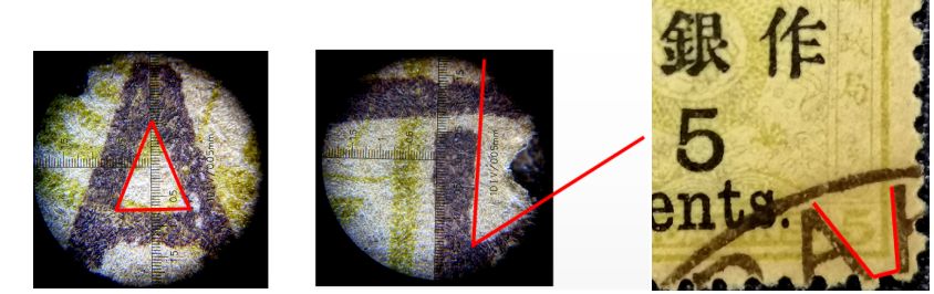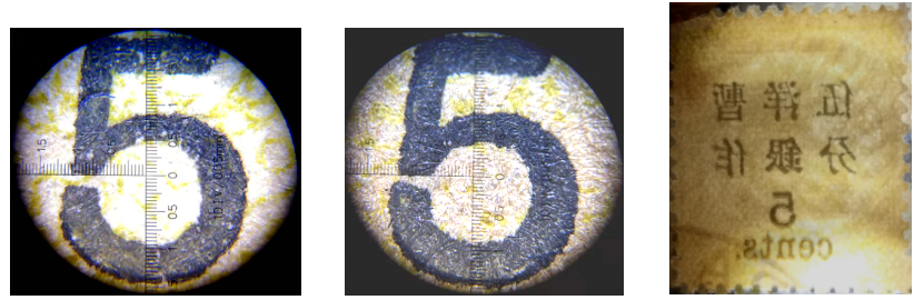 从左至右:待分析邮票加盖细节 小龙加盖大字邮票加盖细节 2枚邮票加盖叠合验证