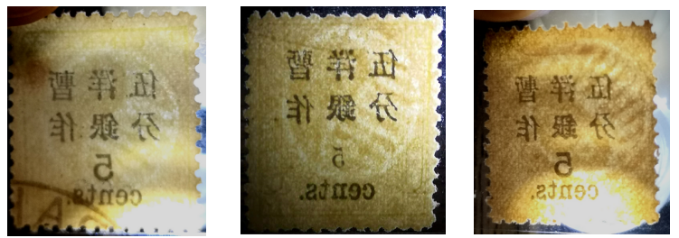 从左至右:待分析邮票细节 小龙加盖小字邮票细节 小龙加盖大字邮票细节
