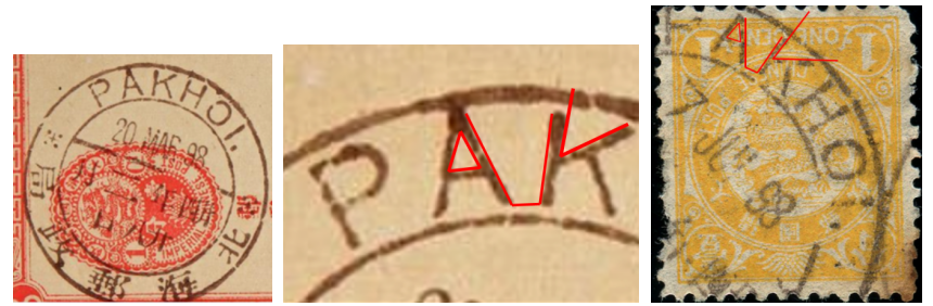 邮戳真伪的辨别也是一个难点,笔者依然采用“对比法”进行分析。笔者在网上找到了1897-1898年期间北海邮政局大圆戳的一些图样,进行对比分析,尤其是最关键的四方连全套票盖销1897年5月8日北海邮政局中英文大圆戳图片。
