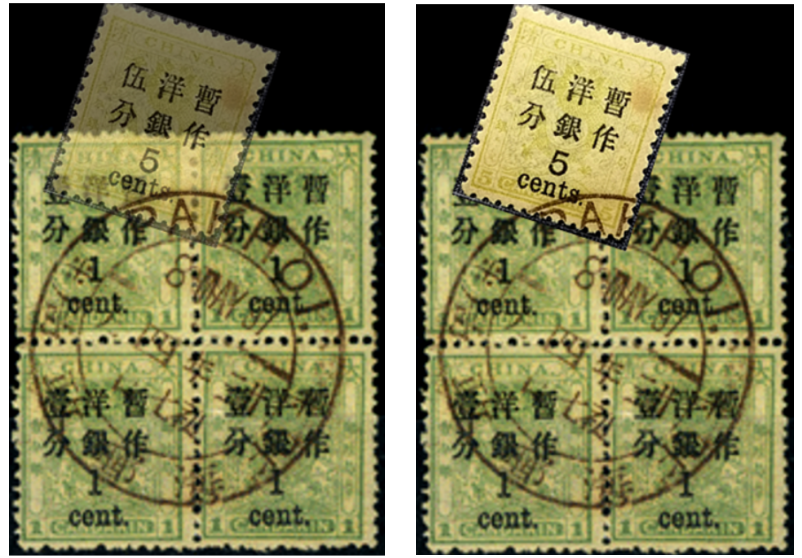 加盖字体分析采用了两种方法:一是放大加盖数字细节观察,加盖字体形状准确无疑;二是使用计算机制图软件,调低待验证邮票的透明度,与真邮票进行叠合验证,2枚邮票叠合准确无疑。这种分析方法是计算机软件技术发展为邮票真伪分析提供的新方法。笔者也尝试使用强光源背射直接叠合观察,但是效果与制图软件相差太大,无法进行准确分析。