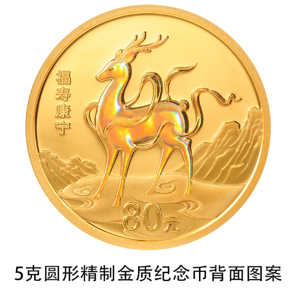 5克圆形金质“福寿康宁”纪念币背面图案为鹿、祥云、山脉等装饰组合图案,并刊“福寿康宁”字样及面额。