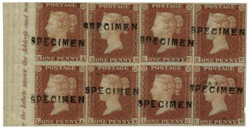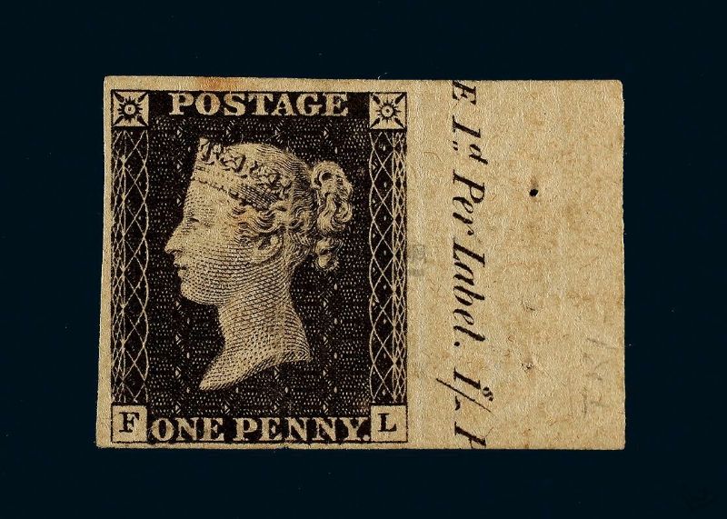 “ 黑便士 ”邮票使邮政工作大大前进了一步,标志着世界近代邮政的产生,具有划时代的意义。“ 黑便士 ” 是颜色和面值的合称。它采用黑色雕刻版印刷的无齿孔,不标国名,只有女王的肖像,当时世界上还无邮票,英国是世界上第一个发行邮票的国家,至今英国仍然是世界上唯一的一个邮票上无国名的国家。图案上方有“ 邮资 ”(POSTAGE)字样,下方是表示面值的“ 一便士 ”(ONE PENNY)的字样,一便士为黑色的,-印张每行由12枚邮票组成,共20行,每张240枚。这是因为英国当时币制为1镑=20先令=240便士,一行12枚正好是一先令(12便士),一个全印张正好一英镑(如下图)。特别有趣的是邮票的下面两角都各有一个英文字母,同一行上的每枚邮票图案左下角的字母相同。第一行A,第二行是B,以下按字母顺序类推;在图案的右下角的字母则表示邮票印在张中的位置,从左向右按字母的顺序排列,如第一横排从左至右为AA、AB、AC直至AL,第二横排依次为BA、BB、BC、直至BL…… 这样安排的目的是为了防止仿造。尽管1840年的邮票现存数量相当可观,但要复原原来的一个完整的印张却是非常困难的。由于邮票刚刚问世,人们还不大懂得邮票是什么,所以每整张“ 黑便士 ”的纸边上者印有说明文字:“ 每一枚邮票是一便士,每行十二枚售一先令,每全张售一英镑。把邮票贴在收信地址右上方,涂湿标签时,请勿擦掉背胶。 ”