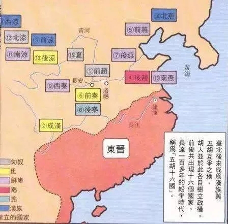 东晋时期,匈奴、鲜卑、羯、氐、羌等五胡乱华,数十国争霸北方,尤其以前凉、后凉、南凉、西凉、北凉、前赵、后赵、前秦、后秦、西秦、前燕、后燕、南燕、北燕、胡夏、成汉等十六国政权为著名,此外在当时具有较大影响的还有仇池、代国、冉魏、西燕、吐谷浑、谯蜀和内迁丁零之翟魏等,实际远不止十六国。(其中谯蜀、前凉、西凉、北燕、冉魏等国均系华夏人所建。)这段时期的中国北方历史上称之为五胡十六国。