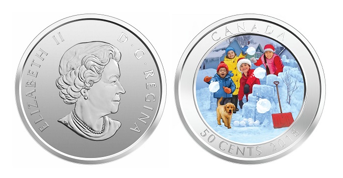 硬币的背面是由加拿大艺术家托尼比安科设计的,他设计了一个充满乐趣的设计,四个顽皮的孩子准备从雪堡后面发射雪球。一只年轻的狗站在前景,警觉地凝视着观众,观众是预定的目标。孩子们穿着原色衣服,以增强设计的年轻活力,红色铲子是用来制作硬包装的雪块,站在右边。