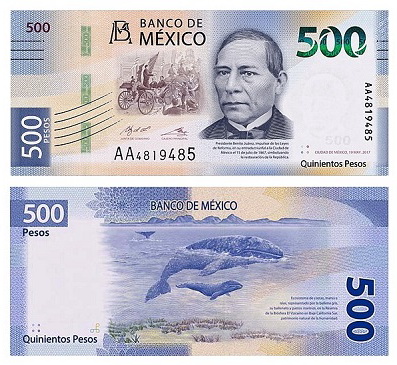 新的500比索钞票以蓝色为主色,按照面额确定的时间顺序,这个价值对应并指的是共和国的改革和恢复的历史过程,共和国的无可争议的领导者是贝尼托华雷斯。